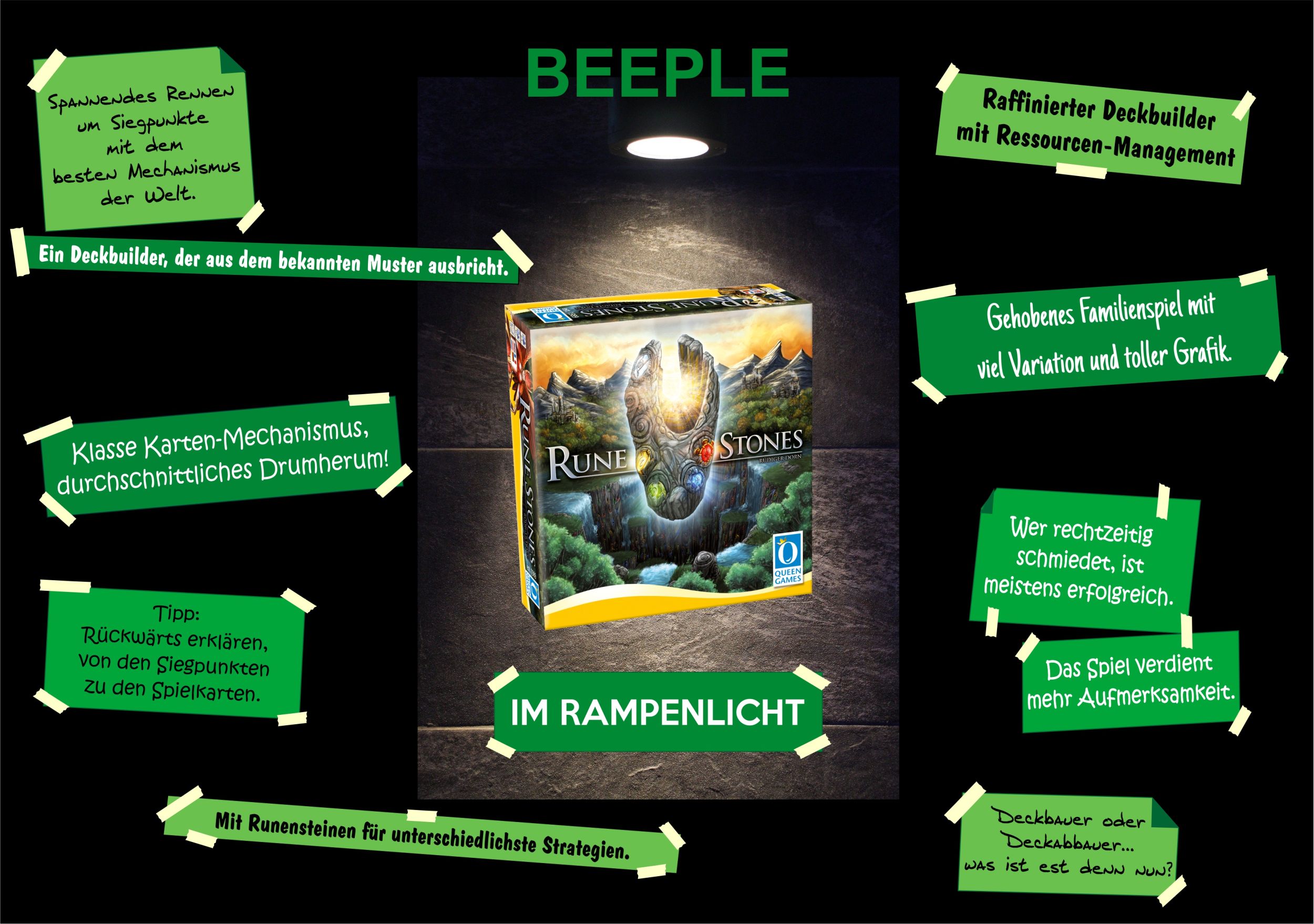 Sommer, Sonne, Rampenlicht! Dort steht bei uns im Juli RUNE STONES von den Rüdiger Dorn. Es ist bei Queen Games erschienen und ein Kennerspiel für 2 bis 4 Personen mit einer Dauer von ca. 60 Minuten.
