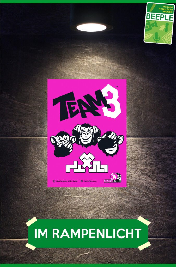 Die drei Spielenden eines Teams verkörpern in TEAM3 die vermutlich weltbekannten drei Affen, von denen einer nicht reden kann, einer nichts hört und einer nichts sieht. Der nicht sprechende Affe sieht auf einer Karte das zu errichtende Gebilde und muss dieses nun dem Affen in der Mitte gestikulierend erklären. Der Affe in der Mitte kann zwar – anders als der bekannte Affe – theoretisch hören, bekommt von seinem Architekten aber nur Gesten übermittelt. Diese muss er nun dem Affen, der nichts sehen kann, so gut erklären, dass es diesem gelingt das Gebilde blind korrekt zu bauen. Das klingt auf dem Papier nach einer chaotischen aber nicht minder witzigen Angelegenheit. Ob es das auch ist, werden einige Mitglieder des Beeple Netzwerks in diesem Rampenlicht kurz kommentieren.